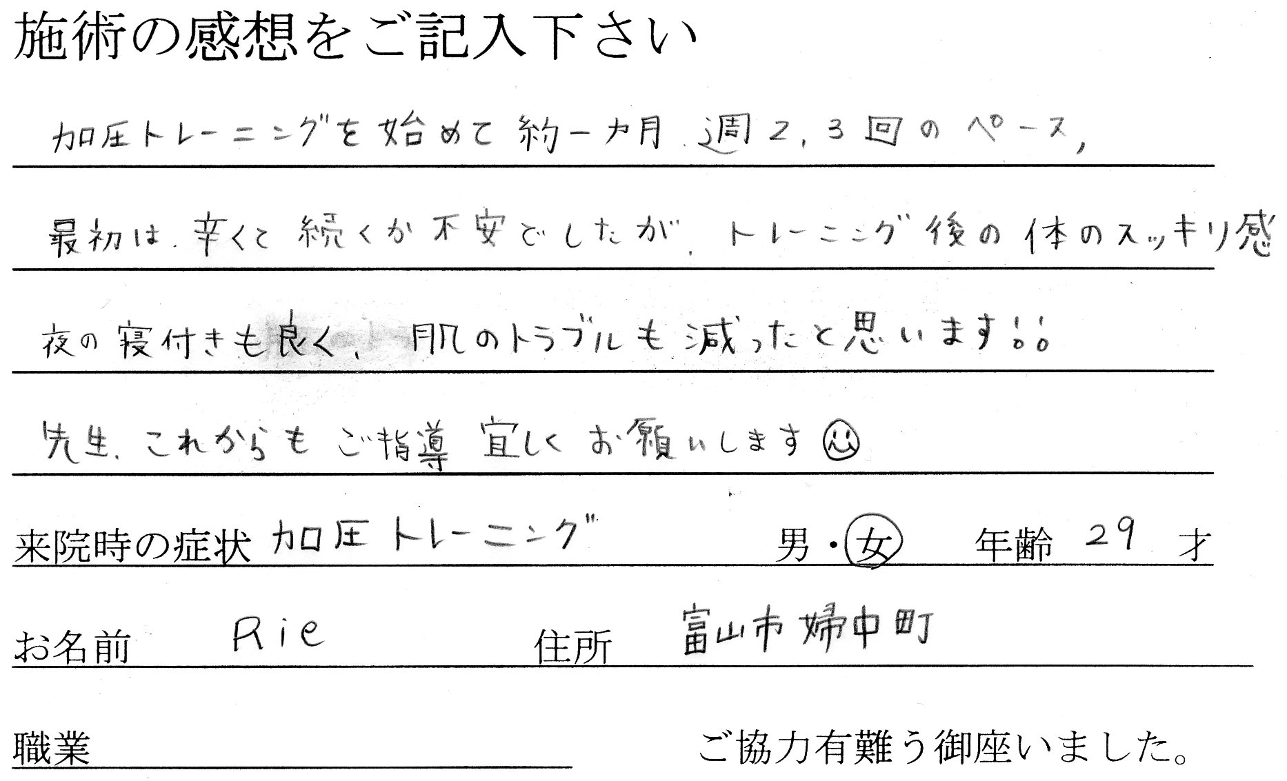お客様の声(加圧トレーニング)29才 富山市婦中町 投稿日時: 2015年4月14日 投稿者: oki-kaatsu (加圧トレーニング) 29才 富山市婦中町 Rie様 加圧トレーニングを始めて約1ヵ月、週2、3回のペース。 最初は辛くて続くか不安でしたがトレーニング後のスッキリ感、 夜の寝付きも良く、肌のトラブルも減ったと思います!! 先生これからもご指導宜しくお願いします(^.^) ご協力有難う御座いました。