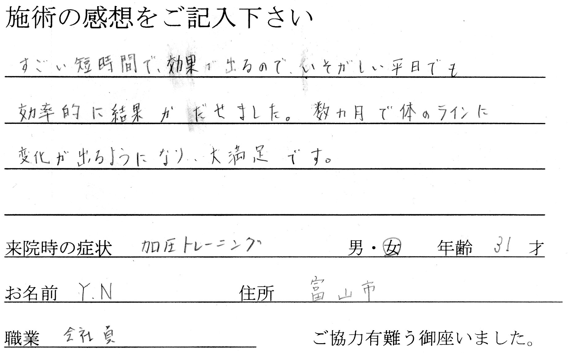 お客様の声(加圧トレーニング)31才 富山市 投稿日時: 2015年4月15日 投稿者: oki-kaatsu (加圧トレーニング) 31才 富山市 Y.N様 すごい短時間で効果が出るので、いそがしい平日でも 効率的に結果がだせました。数ヶ月で体のラインに 変化が出るようになり大満足です。 ご協力有難う御座いました。
