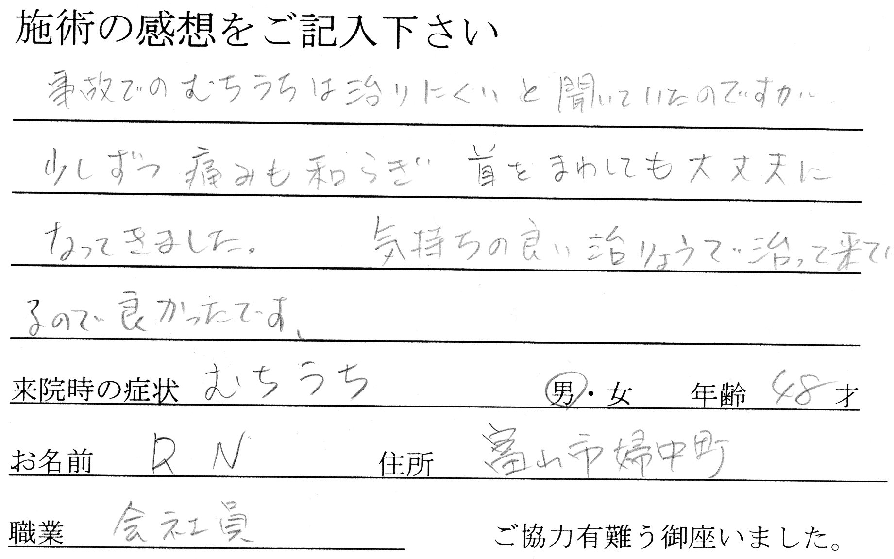 お客様の声(むちうち)48才 富山市 投稿日時: 2015年4月16日 投稿者: oki-kaatsu (むちうち) 48才 富山市婦中町 R.N様 事故でのむちうちは治りにくいと聞いていたのですが 少しずつ痛みも和らぎ首をまわしても大丈夫に なってきました。気持ちの良い治りょうで治って来てい るので良かったです。 ご協力有難う御座いました。