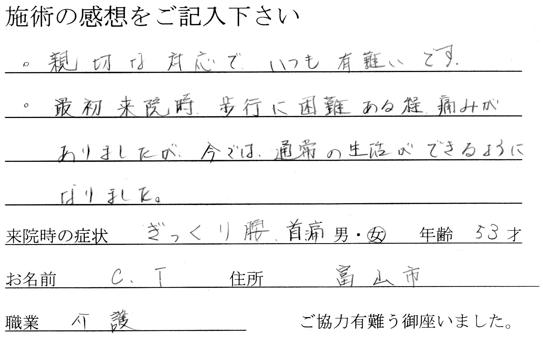 お客様の声(ぎっくり腰、首痛)53才 富山市 投稿日時: 2015年4月21日 投稿者: oki-kaatsu (ぎっくり腰、首痛) 53才 富山市 O.T様 親切な対応でいつも有難いです。 最初来院時、歩行に困難ある程、痛みが ありましたが今では通常の生活ができるように なりました。 ご協力有難う御座いました。