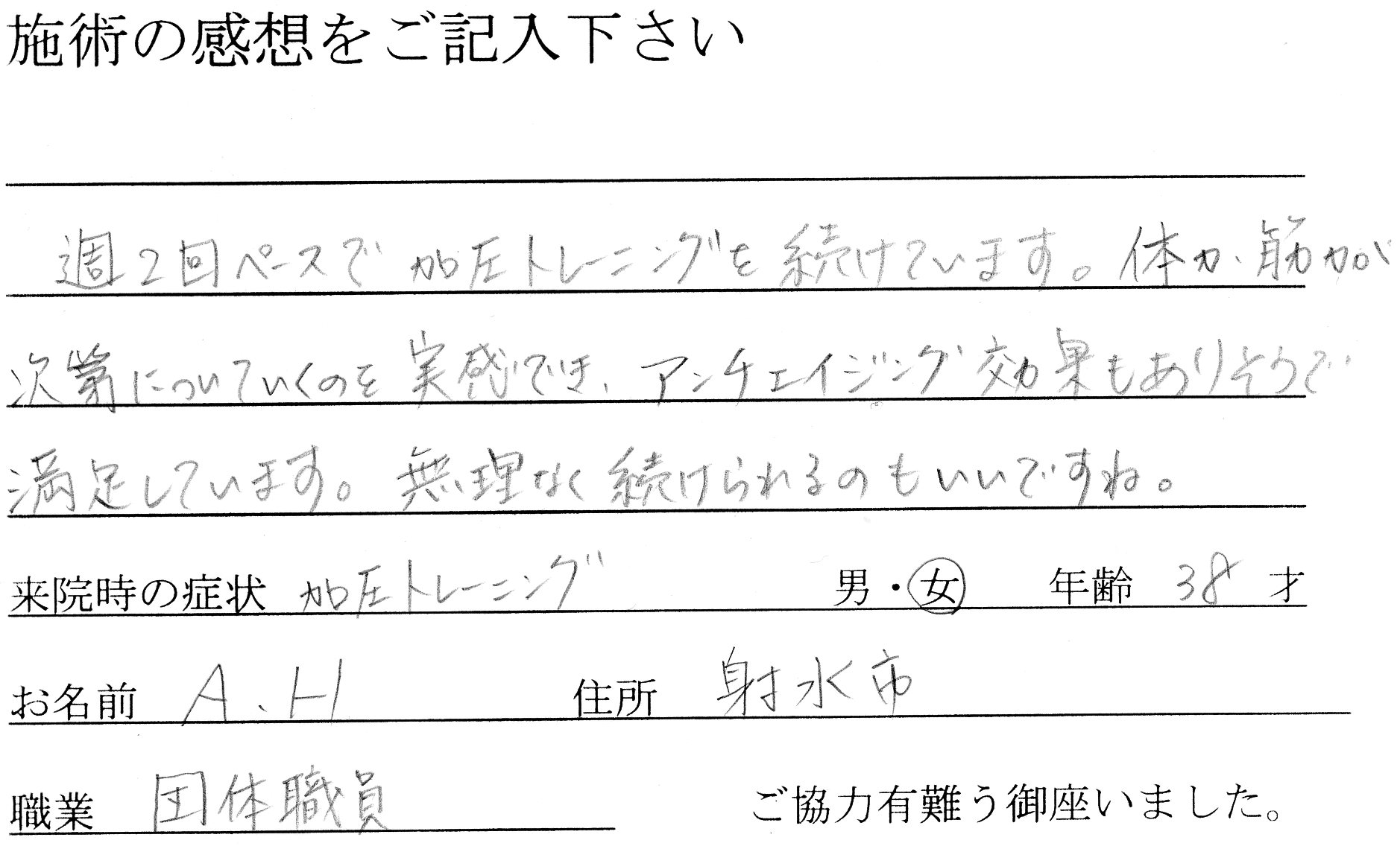 週2回ペースで加圧トレーニングを続けています。体力、筋力が