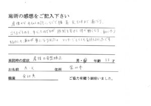 辛かったですが施術を受けて体が軽くなり動いたりするのにも痛みが楽になりました。