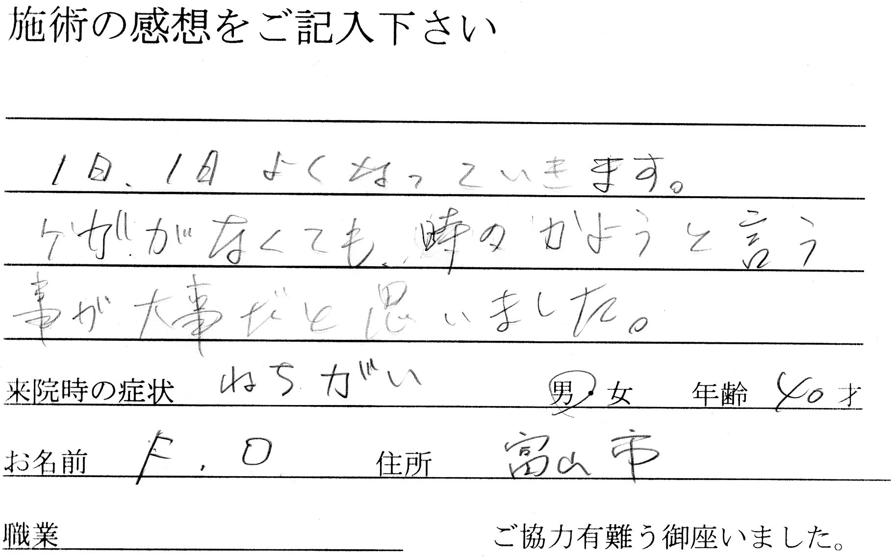 お客様の声(ねちがい)40才 富山市 投稿日時: 2015年5月1日 投稿者: oki-kaatsu (ねちがい) 40才 富山市 F.O様 1日、1日よくなっていきます。 ケガがなくても時々かようと言う 事が大事だと思いました。 ご協力有難う御座いました。