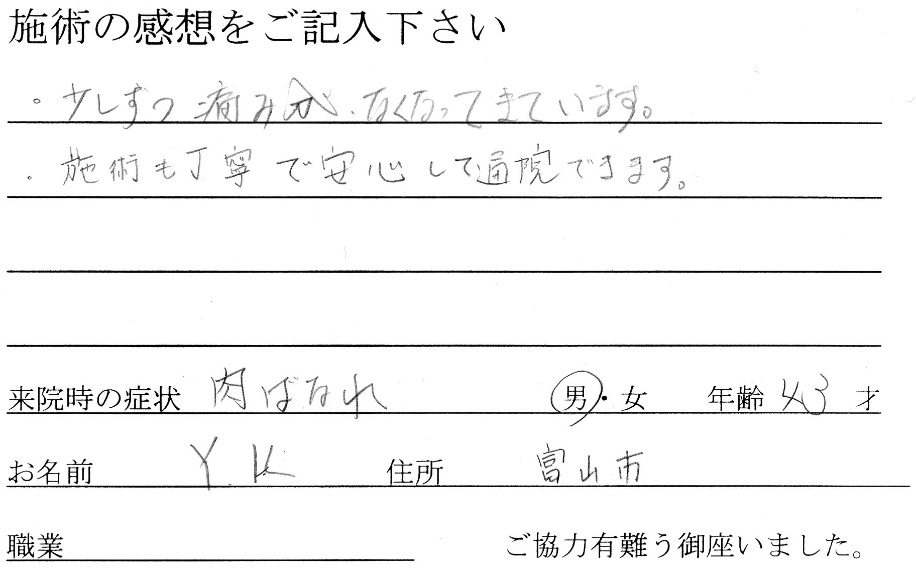 お客様の声(肉ばなれ)43才 富山市 投稿日時: 2015年5月11日 投稿者: oki-kaatsu (肉ばなれ) 43才 富山市 Y.K様 少しずつ痛みがなくなってきています。 施術も丁寧で安心して通院できます。 ご協力有難う御座いました。