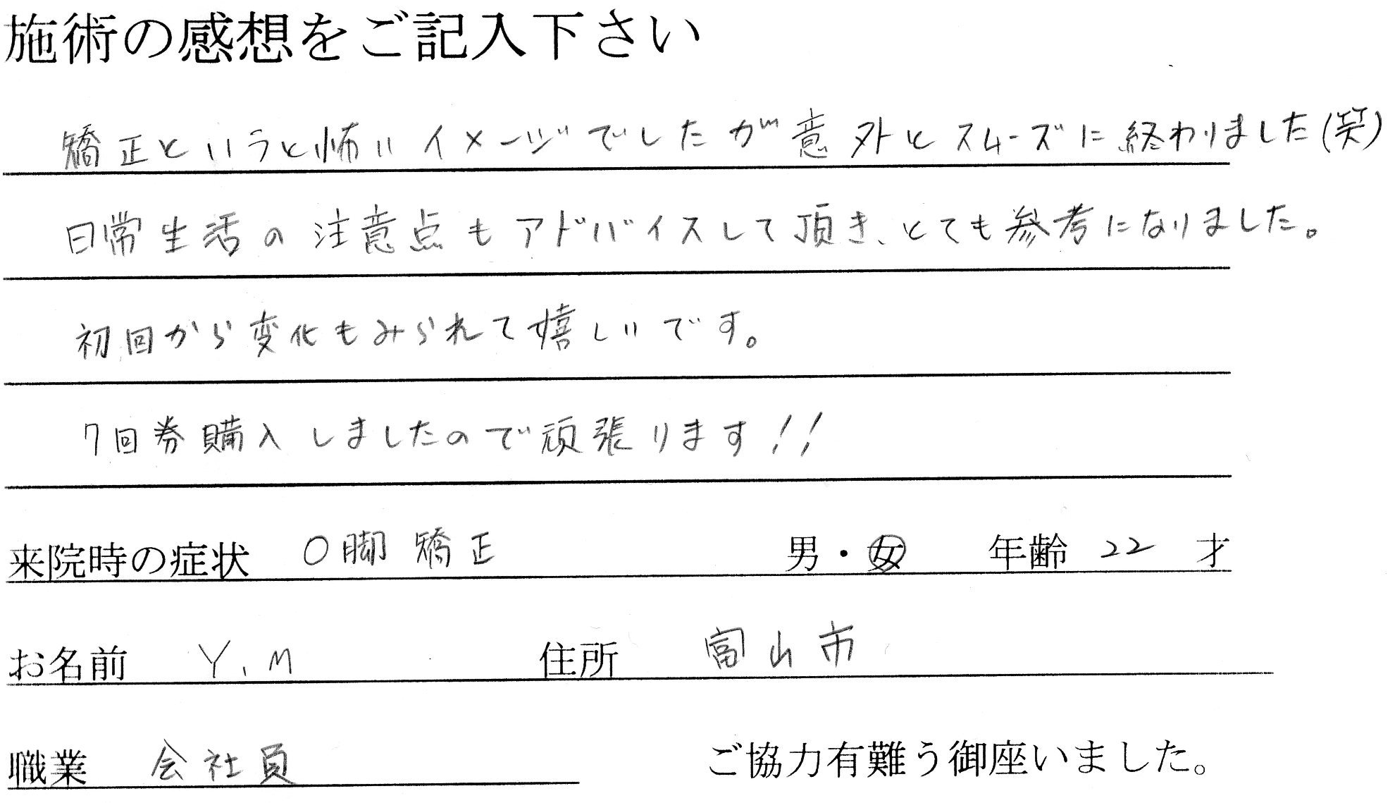 お客様の声(O脚矯正)22才 富山市 投稿日時: 2015年5月13日 投稿者: oki-kaatsu (O脚矯正) 22才 富山市 Y.M様 矯正というと怖いイメージでしたが以外とスムーズに終わりました(笑) 日常生活の注意点もアドバイスして頂き、とても参考になりました。 初回から変化もみられて嬉しいです。 7回券買いましたので頑張ります!! ご協力有難う御座いました。