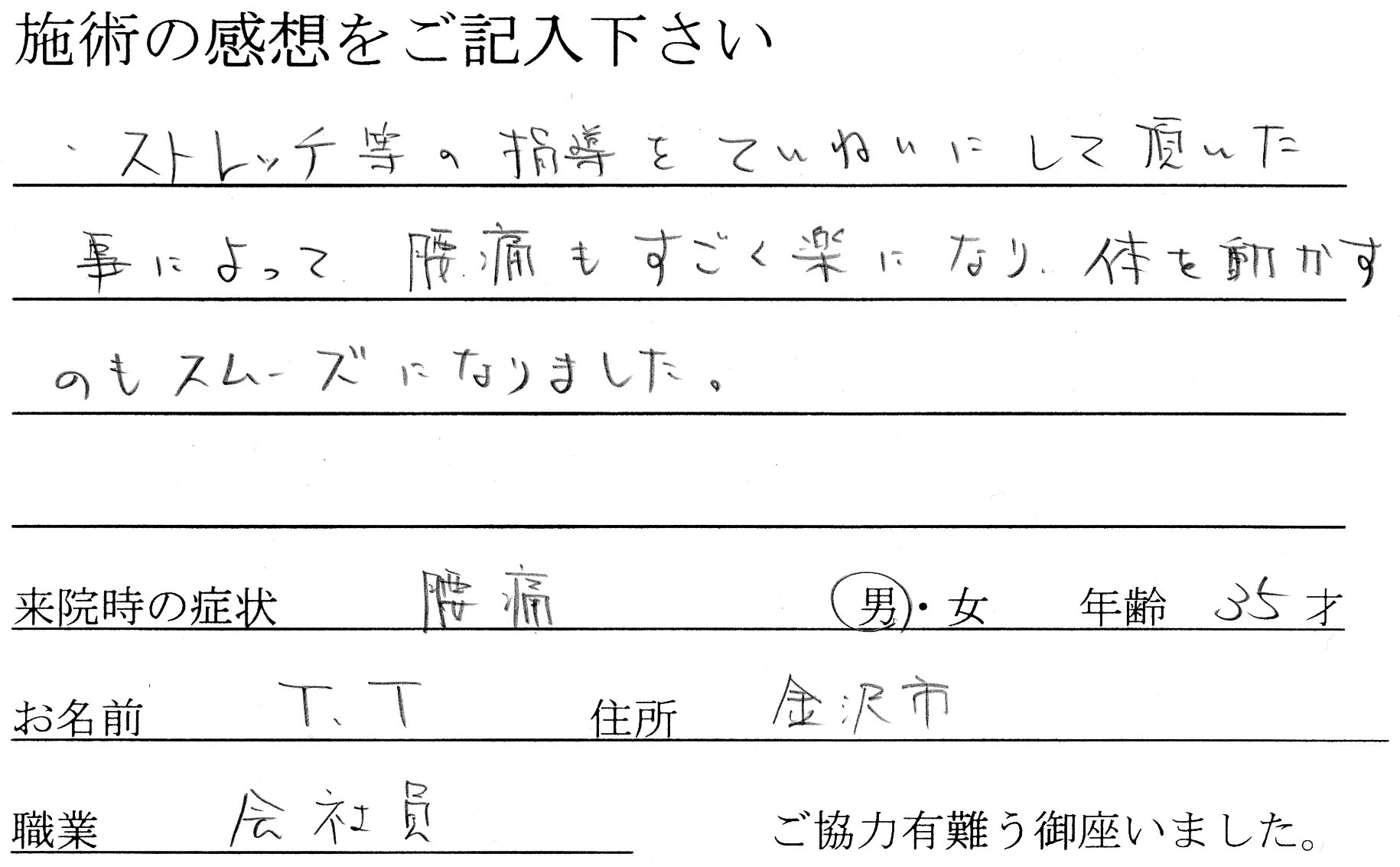 お客様の声(腰痛)35才 金沢市 投稿日時: 2015年5月27日 投稿者: oki-kaatsu (腰痛) 35才 金沢市 T.T様 ストレッチ等の指導をていねいにして頂いた 事によって腰痛もすごく楽になり体を動かす のもスムーズになりました。 ご協力有難う御座いました。