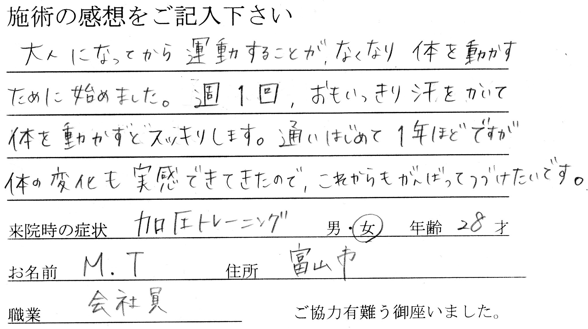 お客様の声(加圧トレーニング)28才 富山市 投稿日時: 2015年5月30日 投稿者: oki-kaatsu (加圧トレーニング) 28才 富山市 M.T様 大人になってから運動することが、なくなり体を動かす ために始めました。週1回おもいっきり汗をかいて 体を動かすとスッキリします。通いはじめて1年ほどですが 体の変化も実感できてきたのでこれからもがんばってつづけたいです。 ご協力有難う御座いました。