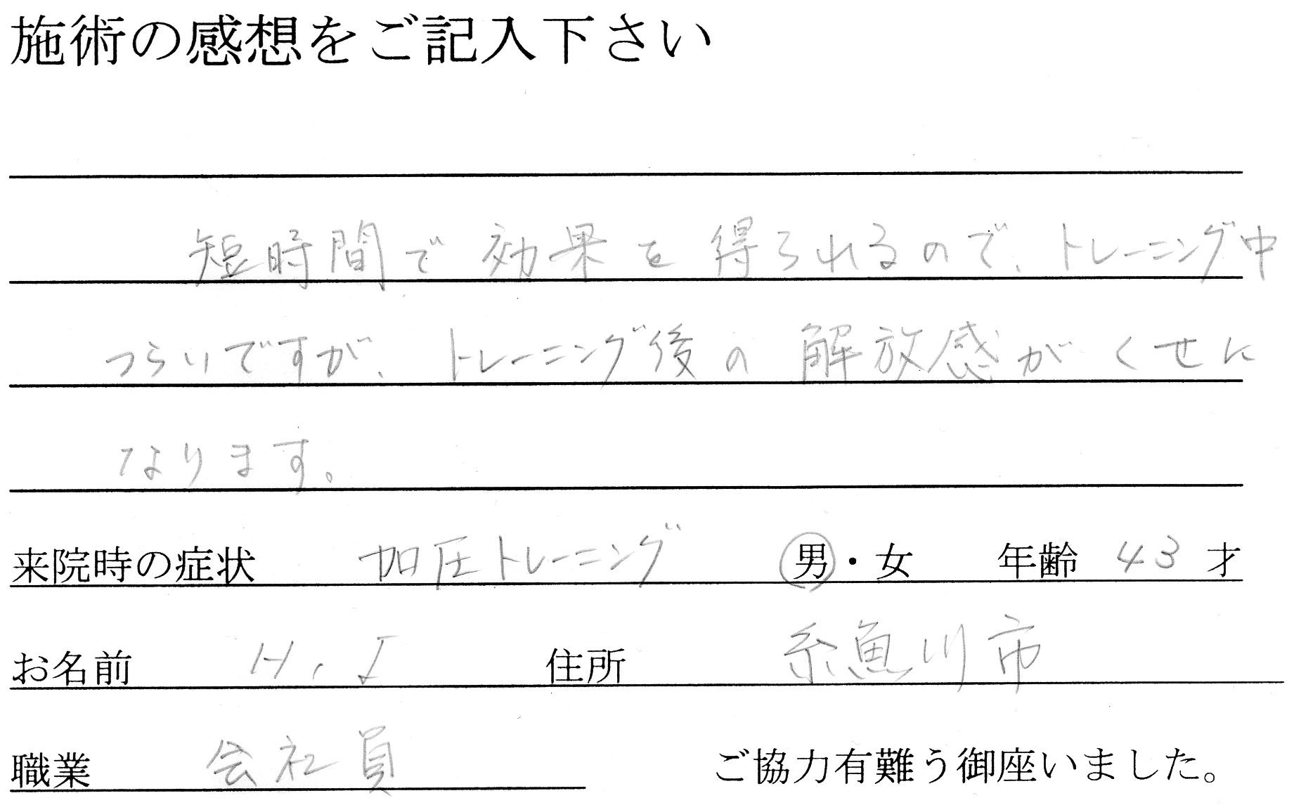 お客様の声(加圧トレーニング)43才 糸魚川市 投稿日時: 2015年9月25日 投稿者: oki-kaatsu (加圧トレーニング) 43才 糸魚川市 H.I様 短時間で効果を得られるので、トレーニング中はつらいですが トレーニング後の解放感がくせになります。 むち打ち・首・肩・腰・膝・足の痛み、スポーツや部活動の怪我、 猫背、姿勢改善、O脚でお困りの方はすぐにお問合せください。 おき接骨院 076-465-2252 富山県富山市婦中町速星799-1